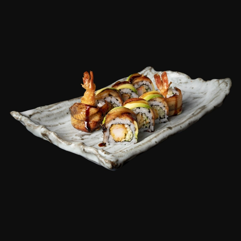 Llagostí en Tempura amb Cogombre cobert d’Anguila i Alvocat