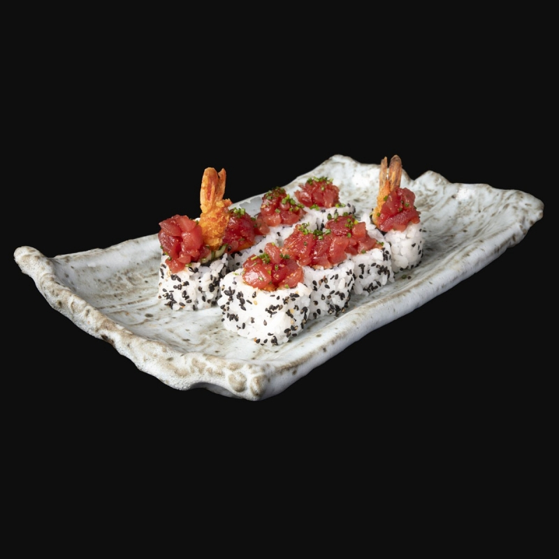 Llagostí en tempura i cogombre recobert de tonyina vermella marinada (8 peces) Picant molt suau.