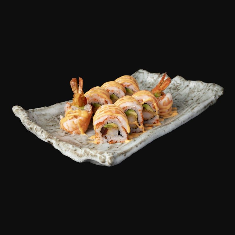 Tempura shrimp, Avocado and Tomato covered with Cooked shrimp and Cocktail sauce slightly spicy (8 pieces)